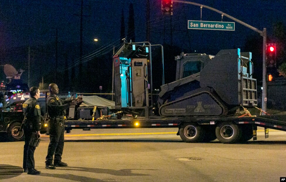 Cảnh sát đứng cạnh một chiếc xe bọc thép sau khi tìm kiếm gần một khu vực ở San Bernardino sau vụ nổ súng, ngày 2/12/2015.