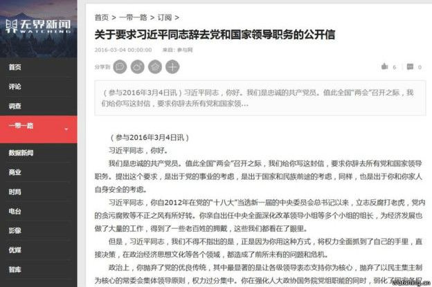 Lá thư xuất hiện chóng vánh trên trang mạng liên kết tới trang của chính phủ Trung Quốc, được ký bởi “các Đảng viên Cộng sản trung thành” và đề tháng Ba 2016.