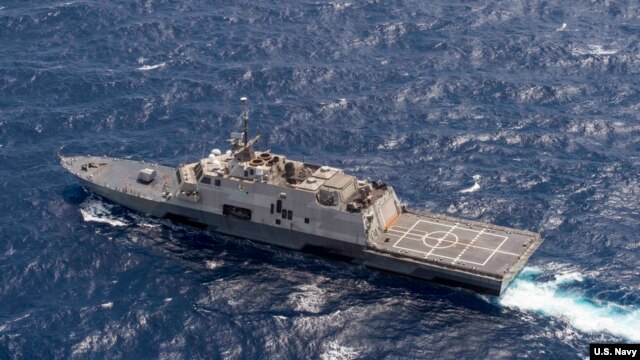 Tàu USS Fort Worth (LCS 3) trong cuộc tuần tra trong vùng biển quốc tế ở Biển Đông với tàu khu trục tên lửa dẫn đường USS Lassen. (Ảnh: US Navy/Joe Bishop).
