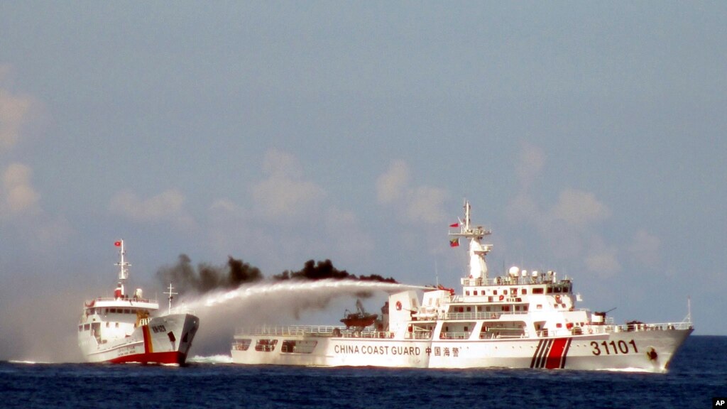 Tàu Trung Quốc xịt vòi rồng, không cho vào tàu Việt Nam tiến gần đến khu vực giàn khoan 981 hoạt động ngày 8/5/2014.