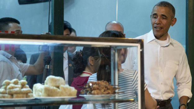 Trong một quán ăn bình dị của Hà Nội, Tổng thống Hoa Kỳ Barack Obama dùng bữa tối chỉ hết 6 USD cùng đầu bếp Anthony Bourdain hôm thứ Hai 23/5.
