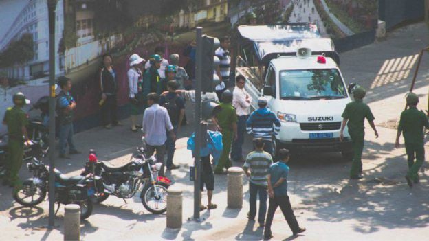 Nhà báo Huỳnh Ngọc Chênh ngồi tọa kháng tại đây và được một số người mặc thường phục đưa đi.