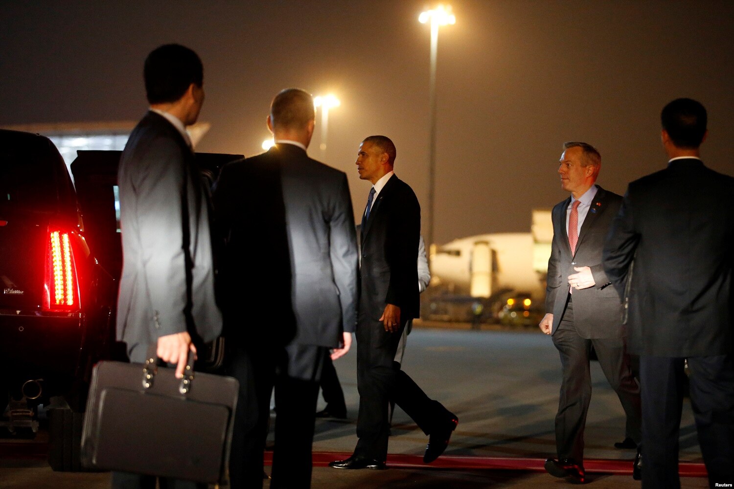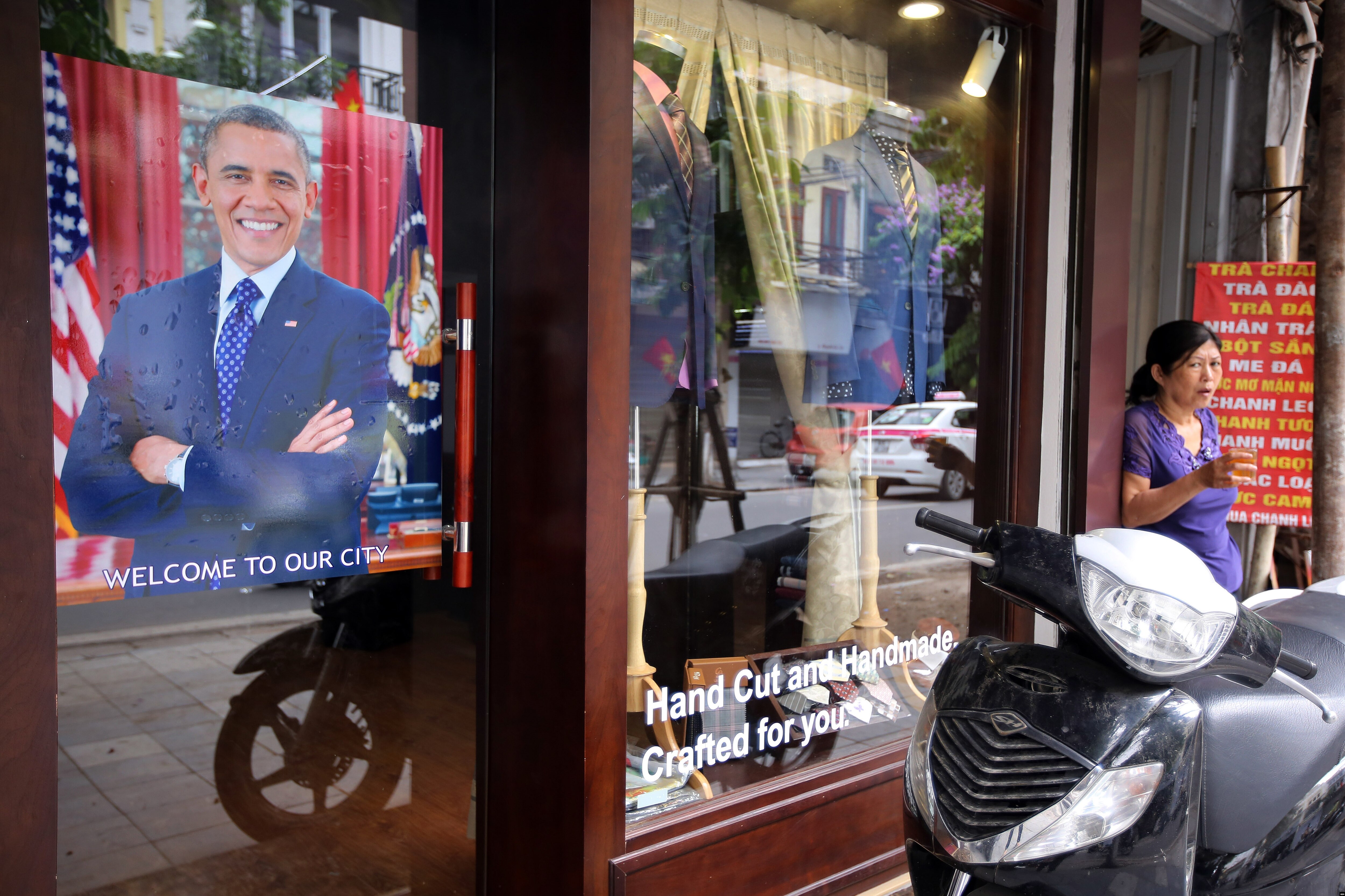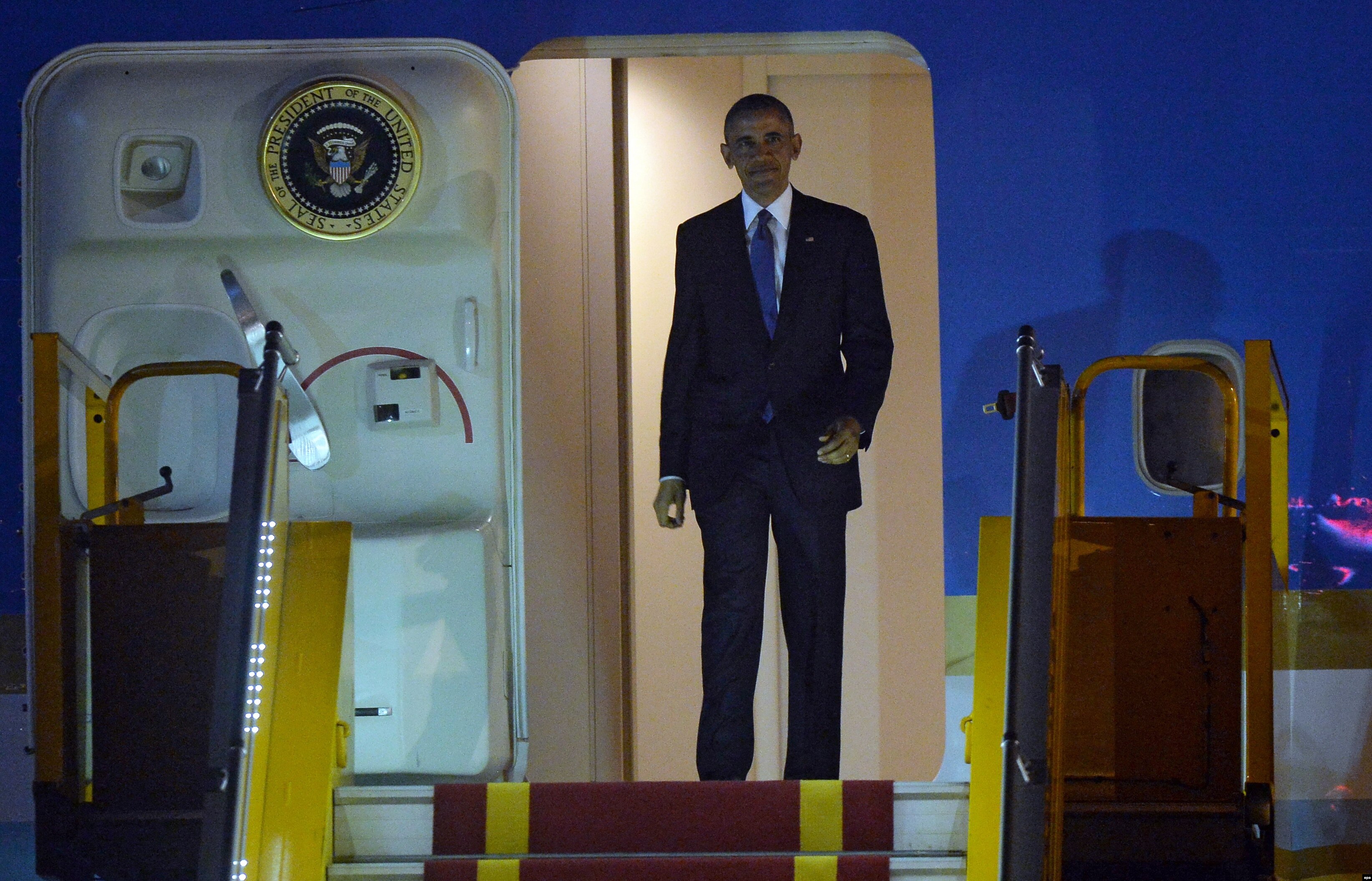 Khi đoàn xe của Tổng thống Obama rời Sảnh VIP của phi trường Nội Bài, tòa nhà chỉ dành để đón tiếp các quan chức và khách cấp cao, họ đi ngang qua những dãy cột cờ treo quốc kỳ Mỹ và Việt Nam và hai bích chương lớn màu đỏ mang các dòng chữ vàng “Nhiệt liệt chào mừng ngày bầu cử đại biểu Quốc hội khóa XIV và đại biểu Hội đồng Nhân dân các cấp nhiệm kỳ 2016-2021!” và “Bầu cử đại biểu Quốc hội và đại biểu Hội đồng Nhân dân các cấp là trực tiếp góp phần xây dựng nhà nước pháp quyền XHCN Việt Nam của nhân dân, do nhân dân, vì nhân dân”.
