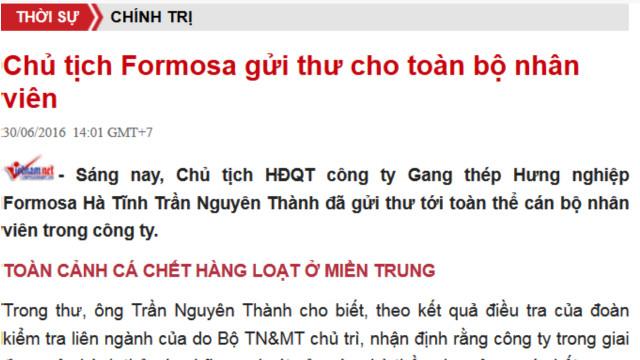Báo mạng Vietnamnet của Bộ Thông tin và Truyền thông đăng một bức thư mô tả là văn bản lãnh đạo Công ty Thép Formosa tại Hà Tĩnh, Việt Nam vừa có thư gửi nhân viên của công ty này, trong đó trích kết quả điều tra liên ngành của nhà nước Việt Nam nhận định Formosa có 'sai sót của nhà thầu phụ gây ra cá chết', theo báo chí Việt Nam.