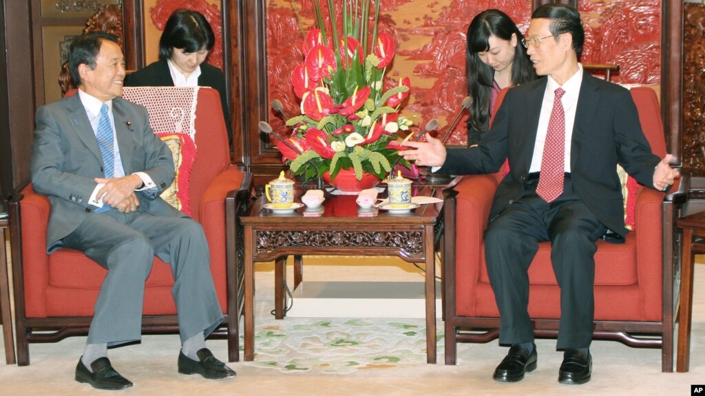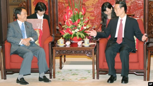 Phó Thủ tướng Trung Quốc Trương Cao Lệ (phải) trong một cuộc hội đàm với Phó Thủ tướng Nhật Bản Taro Aso tại Bắc Kinh vào tháng 6 vừa qua.