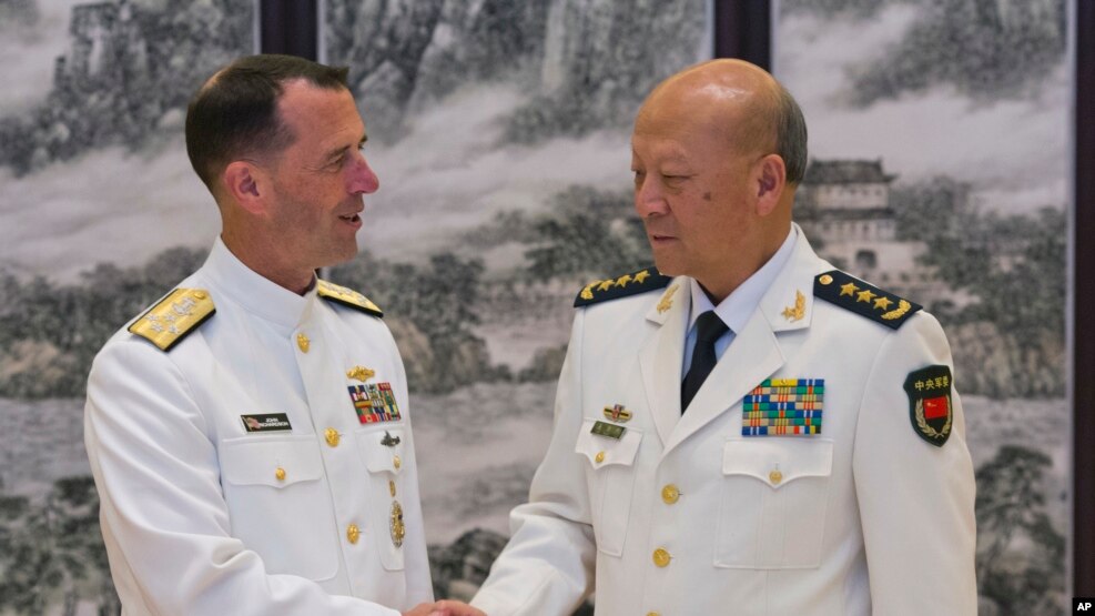 Đô đốc Mỹ John Richardson (trái) bắt tay Tư lệnh Hải quân Trung Quốc Ngô Thắng Lợi tại trụ sở của Hải quân Trung Quốc ở Bắc Kinh, ngày 18/7/2016.